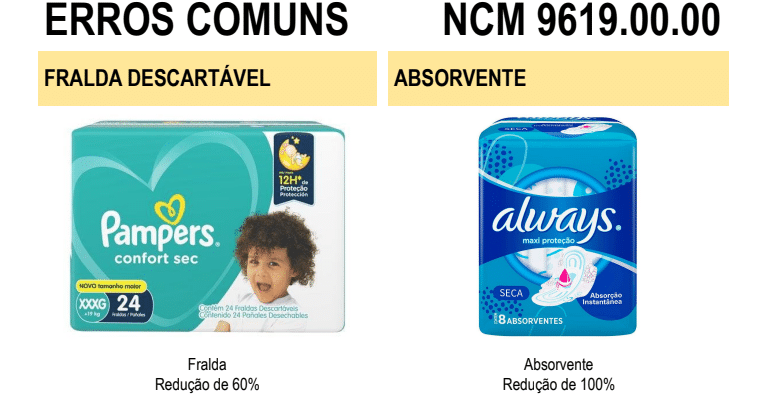 No segmento de produtos de higiene pessoal, a diferenciação entre fraldas descartáveis e absorventes ilustra como a finalidade de uso do produto impacta sua classificação fiscal. As fraldas descartáveis, classificadas na NCM 9619.00.00, beneficiam-se de redução de 60% na tributação, reconhecendo sua essencialidade para cuidados infantis.