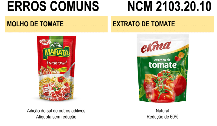 Outro caso emblemático no setor alimentício refere-se à diferenciação entre molho de tomate e extrato de tomate. O extrato de tomate natural, classificado na NCM 2103.20.10, beneficia-se de redução de 60% na tributação por manter suas características naturais e enquadrar-se nos benefícios concedidos a produtos básicos da alimentação.
