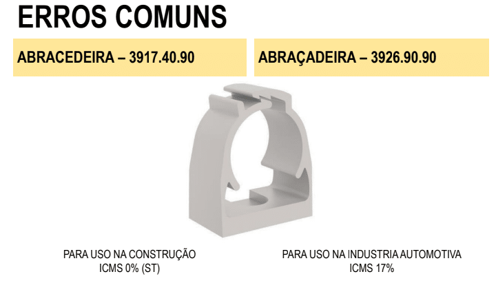 Abraçadeiras destinadas à indústria automotiva, classificadas na NCM 3926.90.90, são tributadas com ICMS de 17%, refletindo o tratamento tributário padrão para componentes automotivos. Esta diferença na tributação pode influenciar decisões estratégicas sobre segmentação de mercado e desenvolvimento de produtos específicos para cada setor.